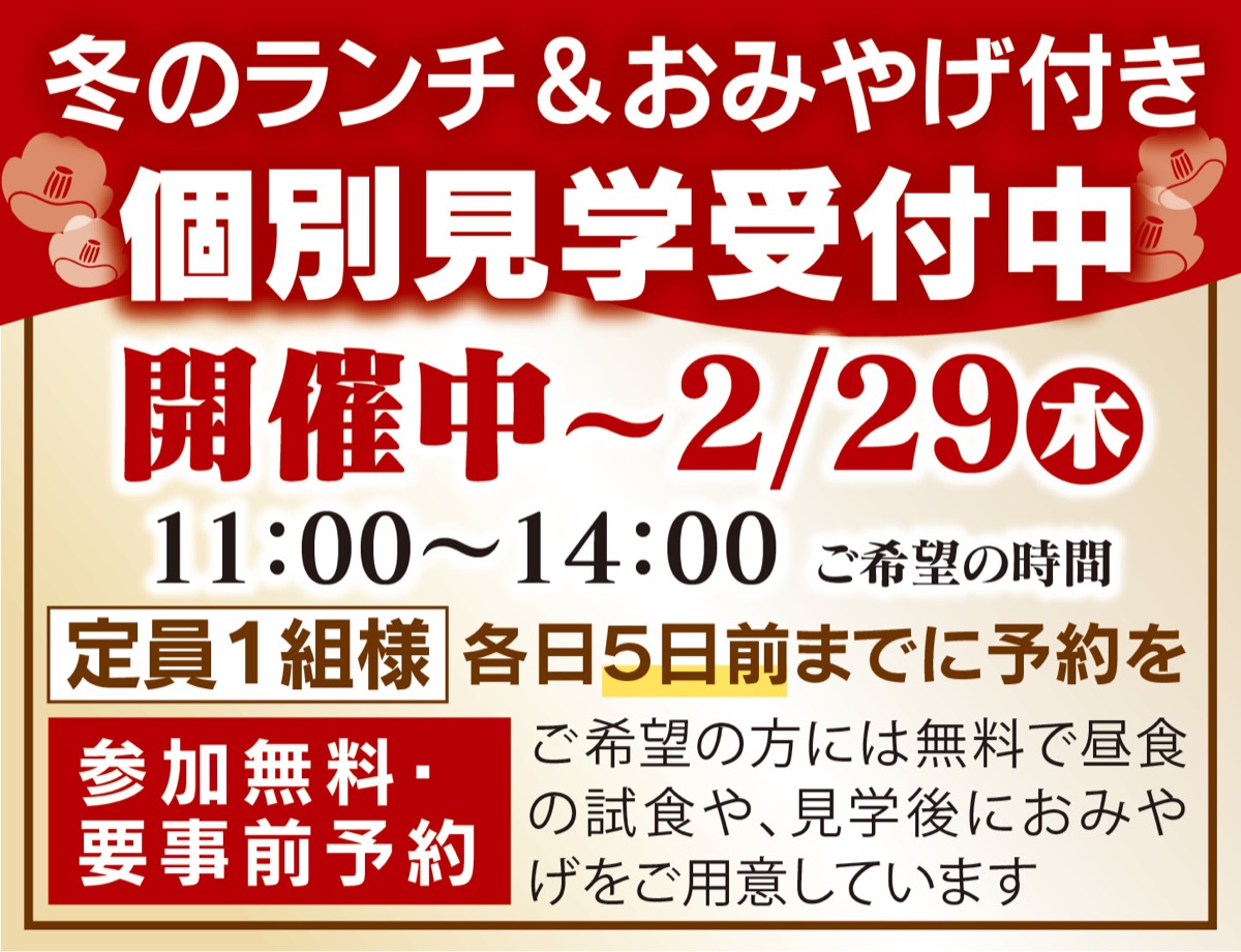 2月29日(木)まで、冬の個別見学を受付中。各日1組で事前予約制。住み心地やスタッフの雰囲気を体感できるので気軽に問い合わせを。昼食の試食や、【1】季節の焼き菓子、【2】ペン&ポストカードセットのどちらかから選べるおみやげ付き。