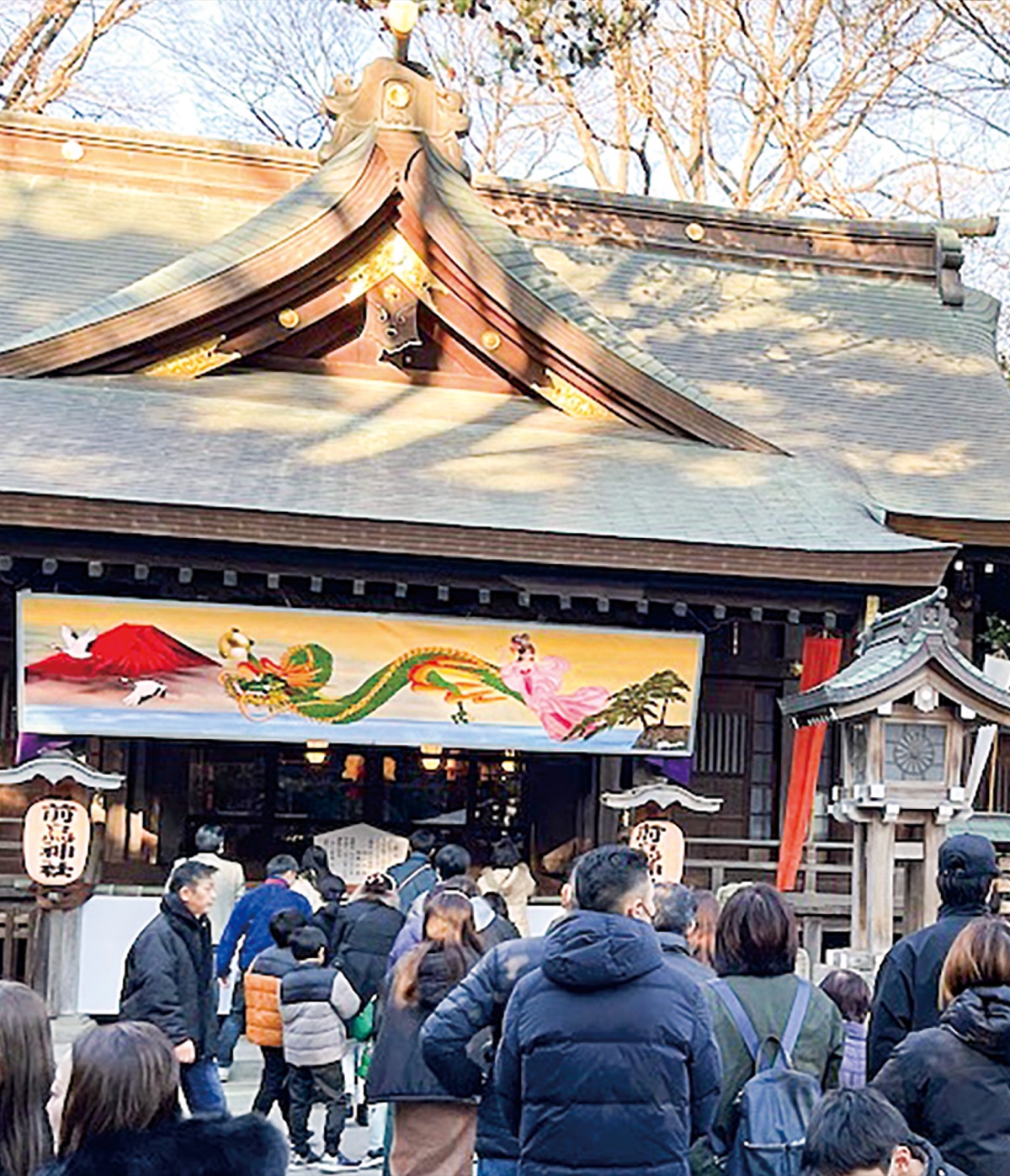 相模国四之宮前鳥神社(神代春彦宮司)の賽銭箱の上に、昨年末から龍や赤富士、鶴、松、天女など縁起物が描かれた献灯が掲出されている。