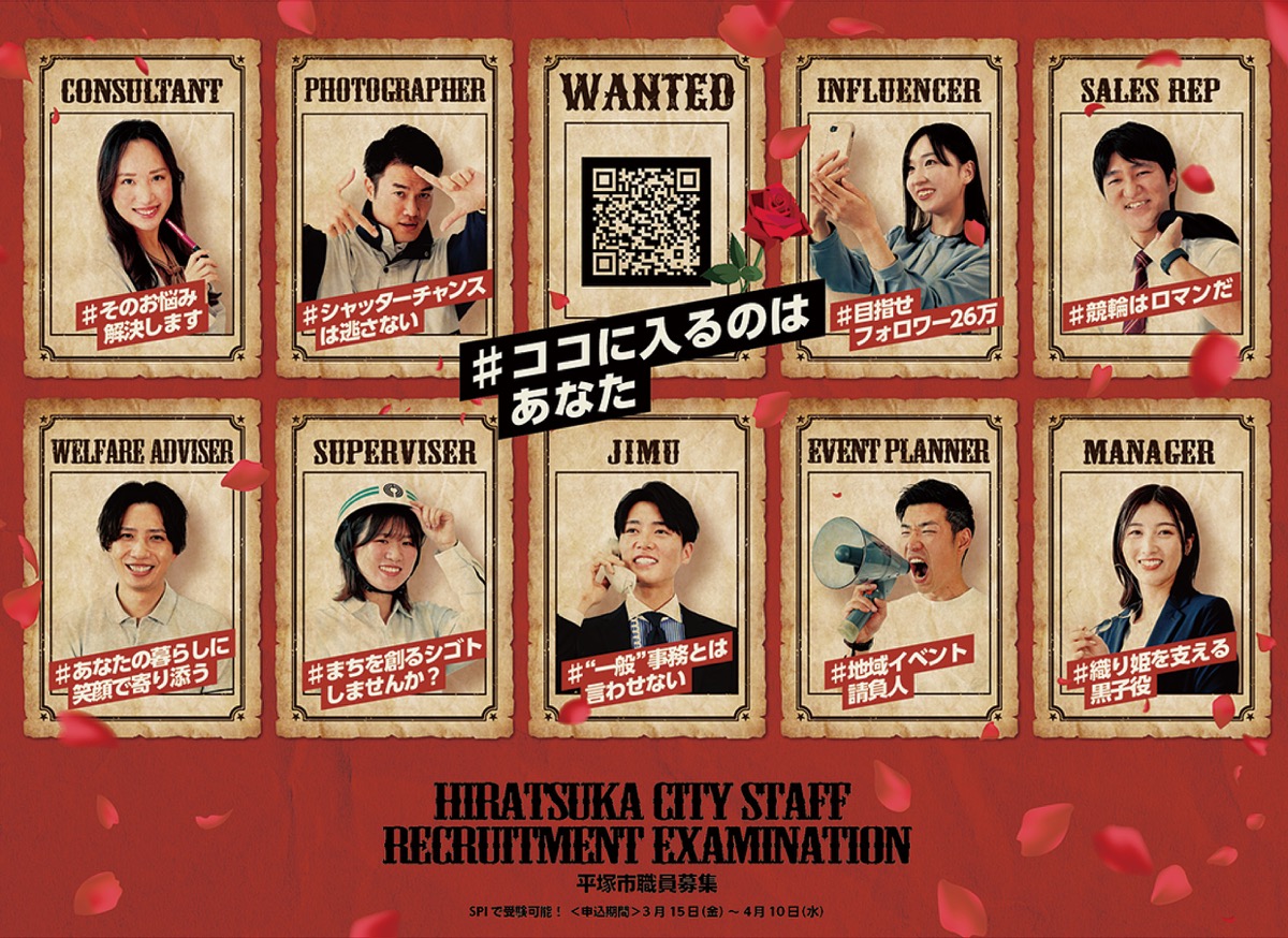 平塚市は、職員採用試験の応募者数増加や内定辞退を減らすため、若手職員によるプロジェクトチームを立ち上げた。若者受けしそうなポスターや動画を作成し、市役所の仕事をアピール。市職員課は「平塚市や働く職員の魅力を出すことで、他市と差別化を図りたい」と話している。