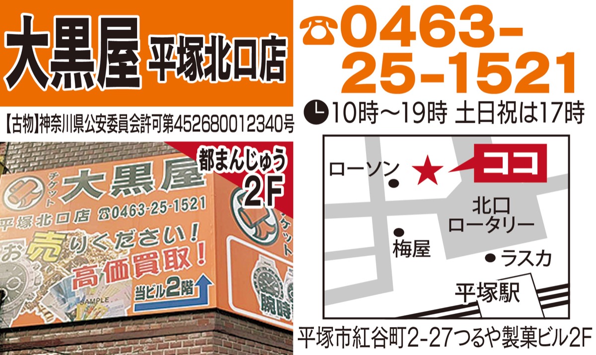 そこでオススメしたいのが、この道15年以上のベテラン査定士が親切丁寧に接客してくれると評判の買取・販売店「大黒屋」だ。平塚駅北口徒歩1分、都まんじゅう2階の好立地に店舗を構え、金・プラチナなどの貴金属はもちろん、ブランドバッグ、切手やテレカ、金券、洋酒など多種多品目の買い取りを行っている。中でも現在は、各種ブランドバッグや時計、ジュエリーの買い取りを強化しているという。