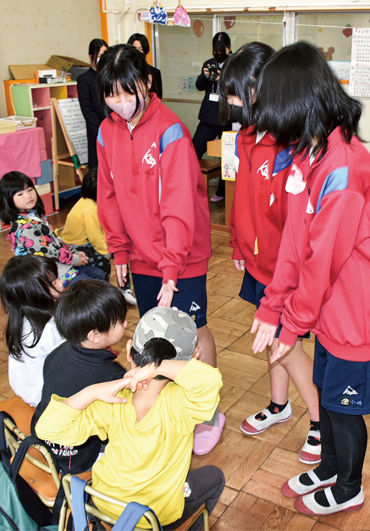 将来、幼稚園などで働くことを希望している6人が参加。生徒は、節分の豆まきで鬼役を務めたり自分たちで考えた椅子取りゲームやじゃんけん列車などで遊んだりしながら、園児との交流を楽しんだ。年長児のクラスでは、園児が生徒に劇やダンスを披露する一幕もあった。