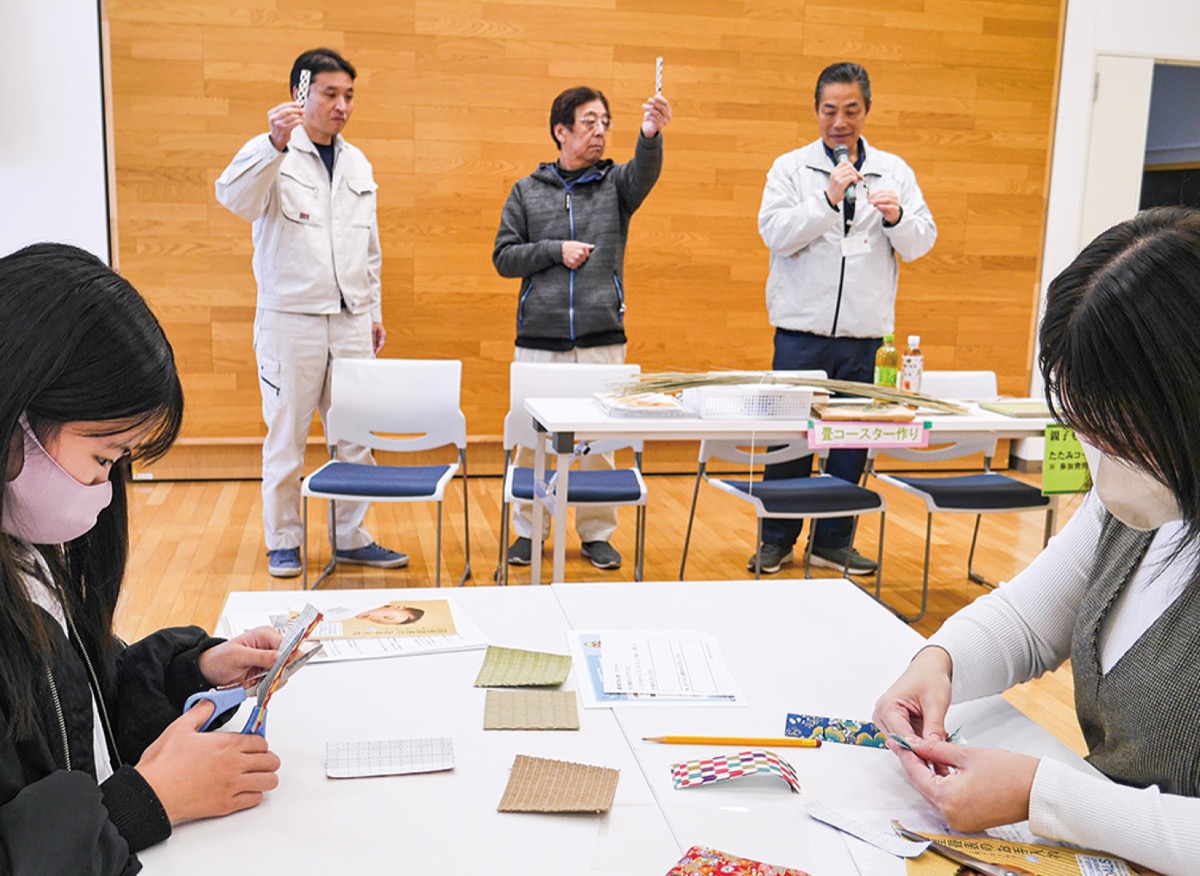 湘南平塚畳工業組合が主催する畳のコースター作りが2月3日、崇善公民館で行われた。講師は、同組合の小野畳店(宮の前)、新倉畳店(明石町)、内田畳店(八千代町)の店主。