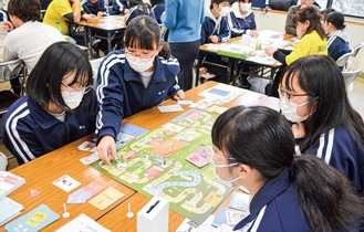 ボードゲームを使って社会の仕組みを学ぶライフ・リテラシー教室が2月17日、花水公民館で行われ、浜岳中学校の生徒ら約20人が参加した。浜岳地区地域教育力ネットワーク協議会ら主催。