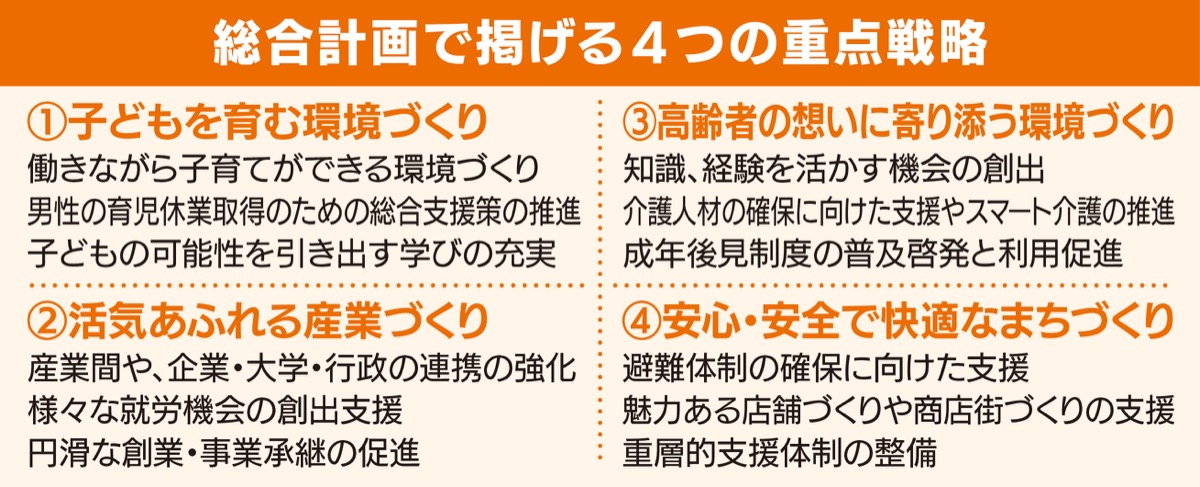 新たな総合計画では、【1】子どもを育む環境づくり【2】活気あふれる産業づくり【3】高齢者の想いに寄り添う環境づくり【4】安心・安全で快適なまちづくりを重点戦略に据え、5分野・27項目の分野別施策をもとに計画を推進。施策ごとに具体的な取り組み内容を掲げ、中間年の27年度と最終年の31年度における数値目標の達成に取り組む。