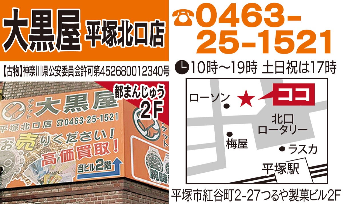 全国に多数店舗を展開する国内最大手の買取業者「大黒屋」。近年、平塚でも増えてきている買取屋。「何処に持っていけばいいの…」と迷っている方にお勧めなのが、平塚駅北口徒歩1分、都まんじゅう2階の好立地にある買取・販売店「大黒屋」だ。