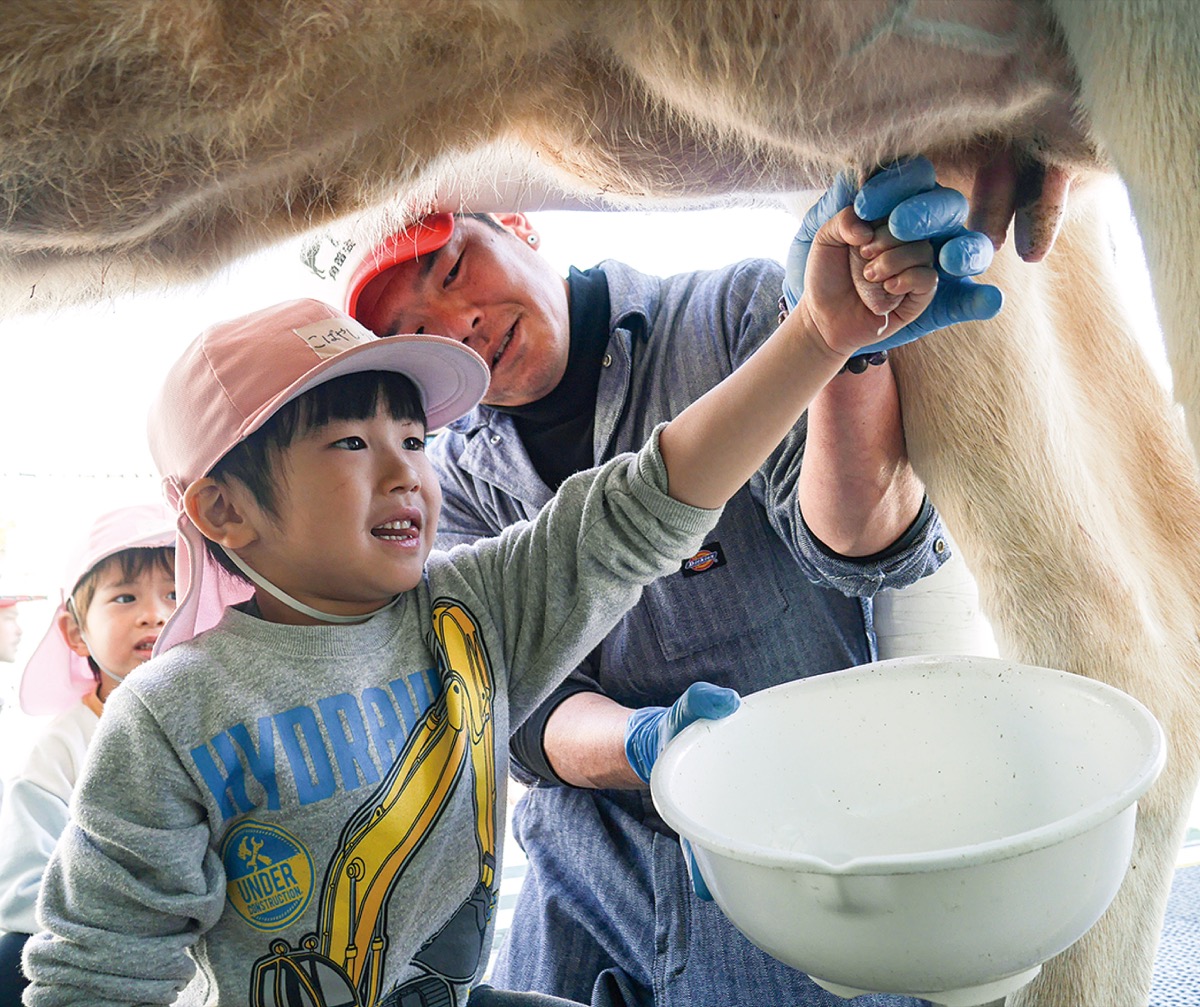 今回、協力してくれた乳牛は3歳のカレンちゃん(丸島酪農)。同時に、子牛2頭に触れる場も設けられ、ふれあいを楽しんだ。園児らは「怖かったけど楽しかった」「ドキドキした」「乳搾りの後、手が牛乳の匂いになった」と笑顔で感想を話した。
