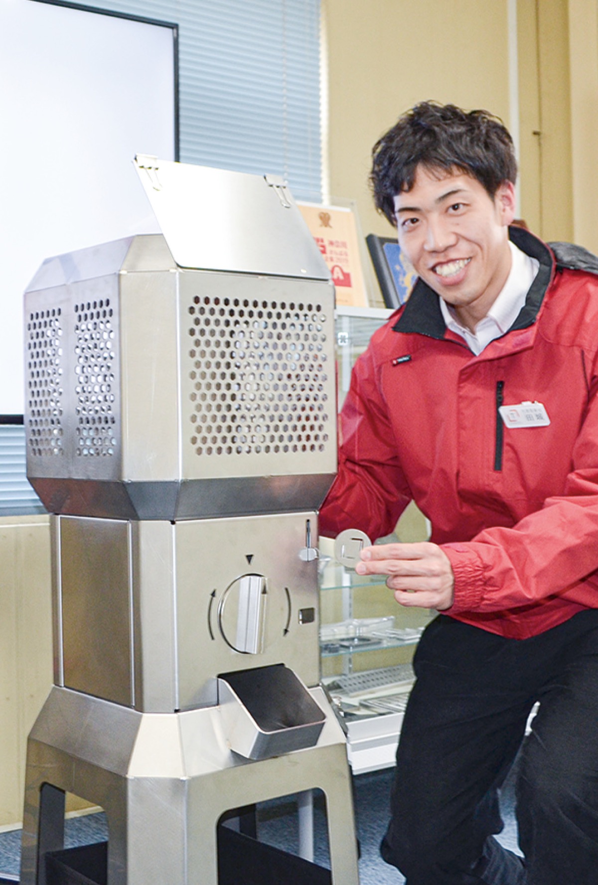 4月に発売するステンレス製のカプセルトイマシンは、同社が長年培ってきた板金加工技術を生かし、100点に及ぶステンレスの部品を溶接して製作。高さ1・18メートル、重さ約35キロで、専用コインを入れてダイヤルを回すと中のカプセルを取り出せる。