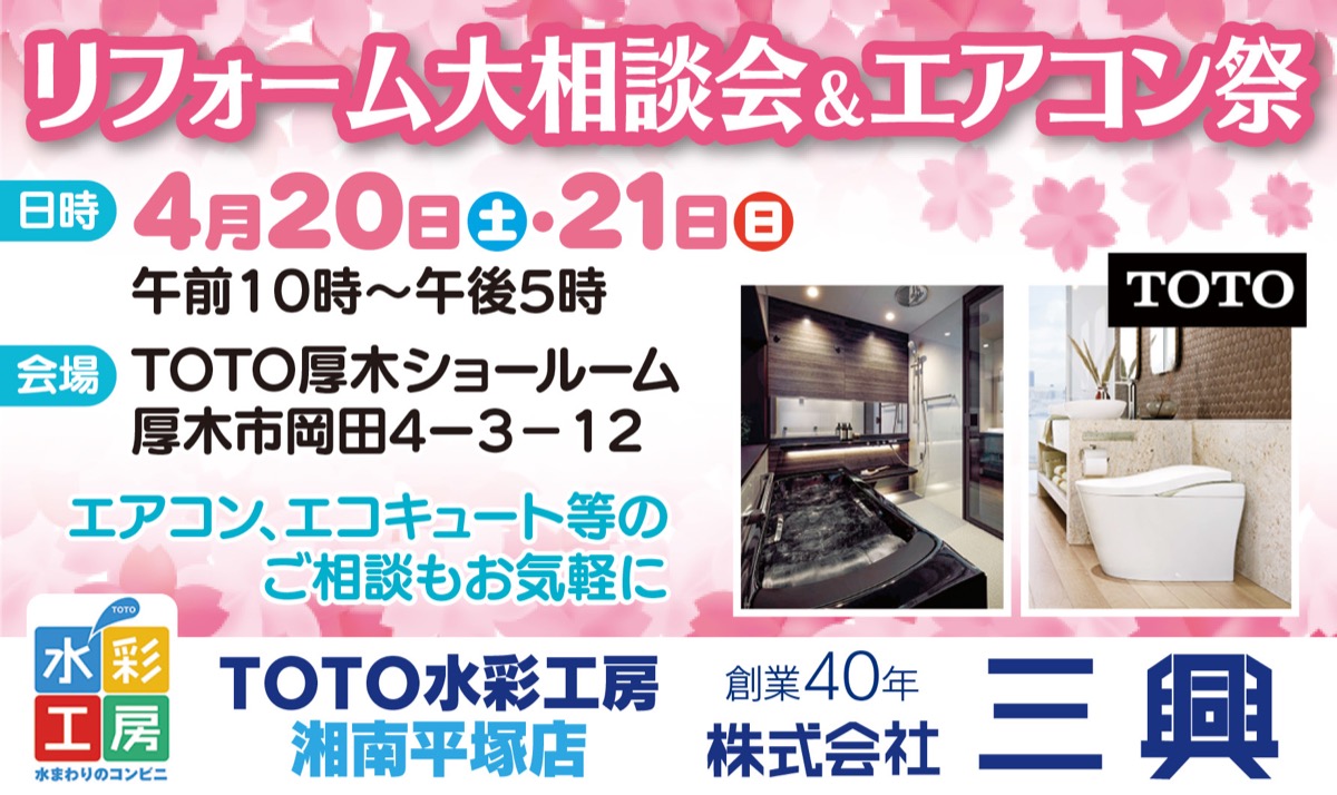 TOTO水彩工房湘南平塚店は、4月20日(土)・21日(日)に「リフォーム大相談会&エアコン祭」を開催する。