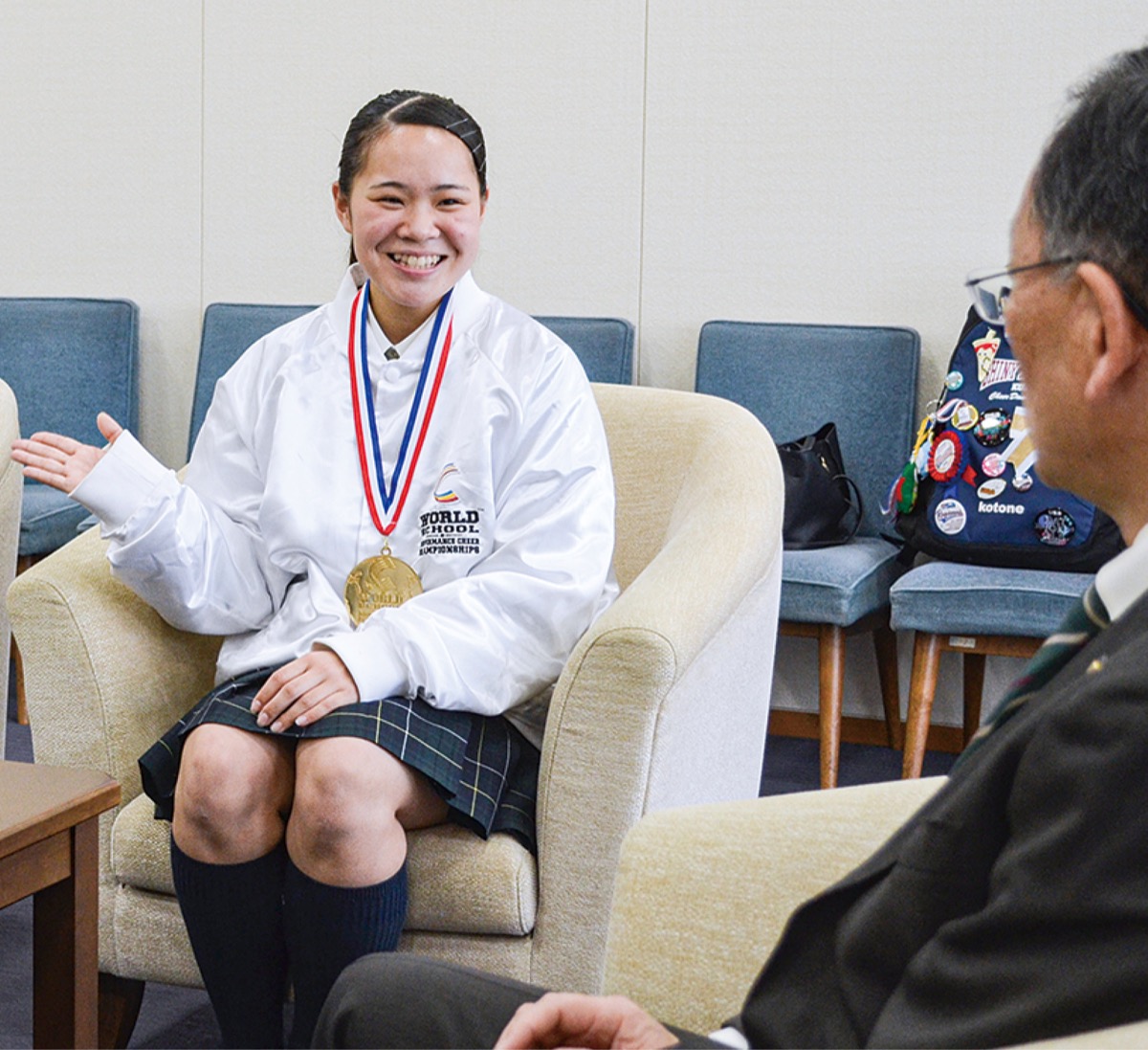 今年2月に米国フロリダ州で開催された「ICU世界スクールパフォーマンスチア選手権大会」の「Varsity Game Day」部門に向上高校チアダンス部(伊勢原市)のメンバーとして出場し、優勝した杉山琴音さん=小鍋島在住・2年=が4月4日、平塚市役所を訪問し優勝報告を行った。