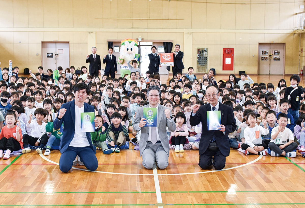 4月16日には全校を代表して崇善小学校で寄贈式が行われ、同社の小泉光哉社長やベルマーレの坂本紘司社長らが出席。小泉社長がSDGsを知っているか尋ねると、児童らは「知っている」と元気よく手を挙げた。小泉社長は父、祖父とともに崇善小学校の卒業生といい、母校の校歌を口ずさむ一幕もあった。