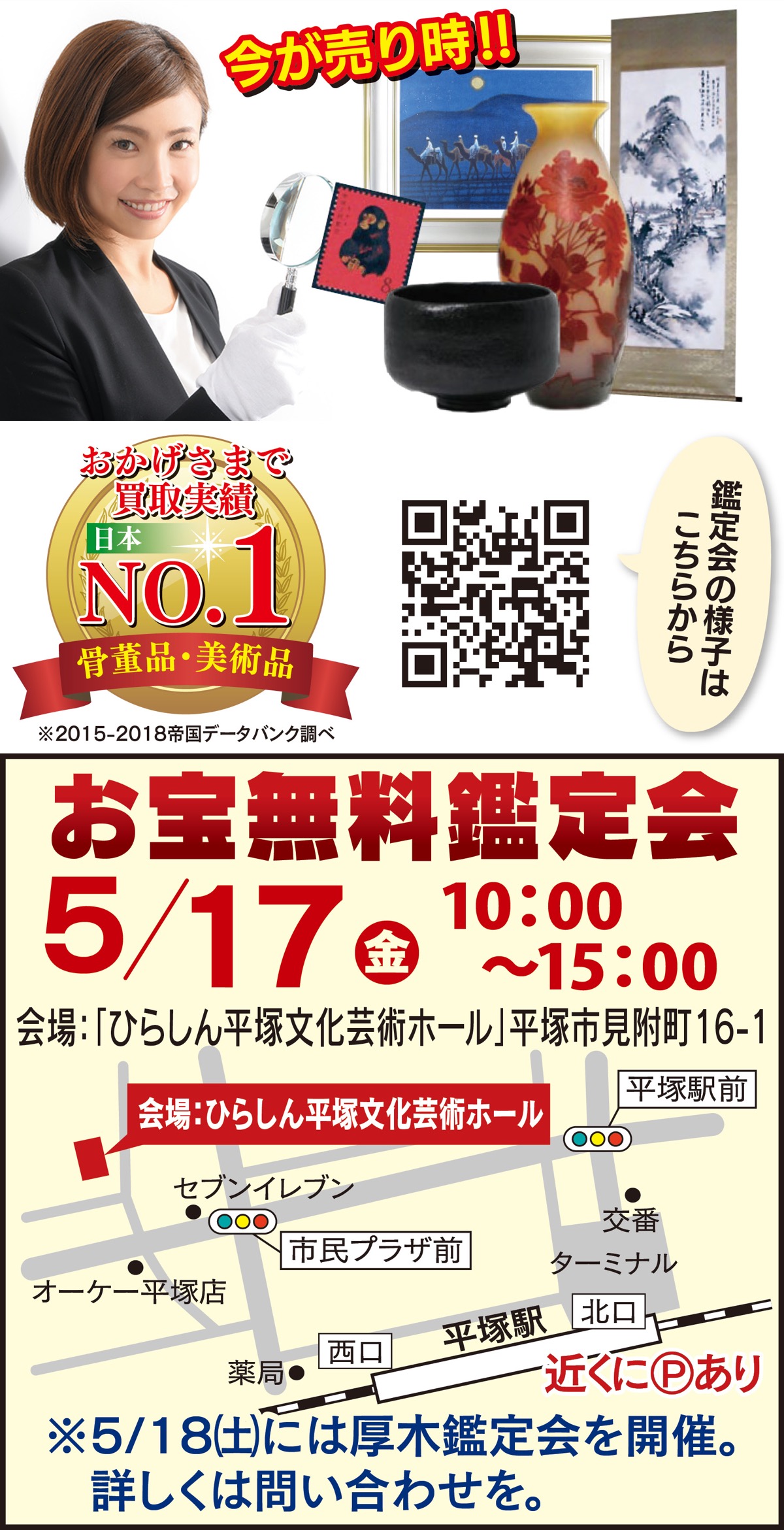 本郷美術骨董館は5月17日(金)、「お宝無料鑑定会」を平塚駅西口のひらしん平塚文化芸術ホール多目的ホールで開催する。同店は東大赤門前で創業40年になる美術品や骨董品の専門店。経験豊富な各分野の鑑定士が27人も在籍し、様々な提案を行う。現代アート、絵画、古美術品等あらゆるジャンルに対応できるのも魅力。TVや新聞、雑誌にも数多くとりあげられている。特に中国美術の買取りを強化中。この機会に足を運んでみて。