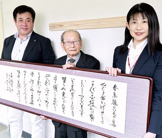 市内平塚で書道教室「圭雪書道院」を主宰する書道家、佐野圭雪(本名・六郎)さんが4月30日、母校の富士見小学校(森下志麻校長・児童数680人)に作品を寄贈した。佐野さんは1927(昭和2)年5月生まれの96歳。神奈川県民書道展の副会長を務め、過去には平塚市美術館賞などを受賞している。