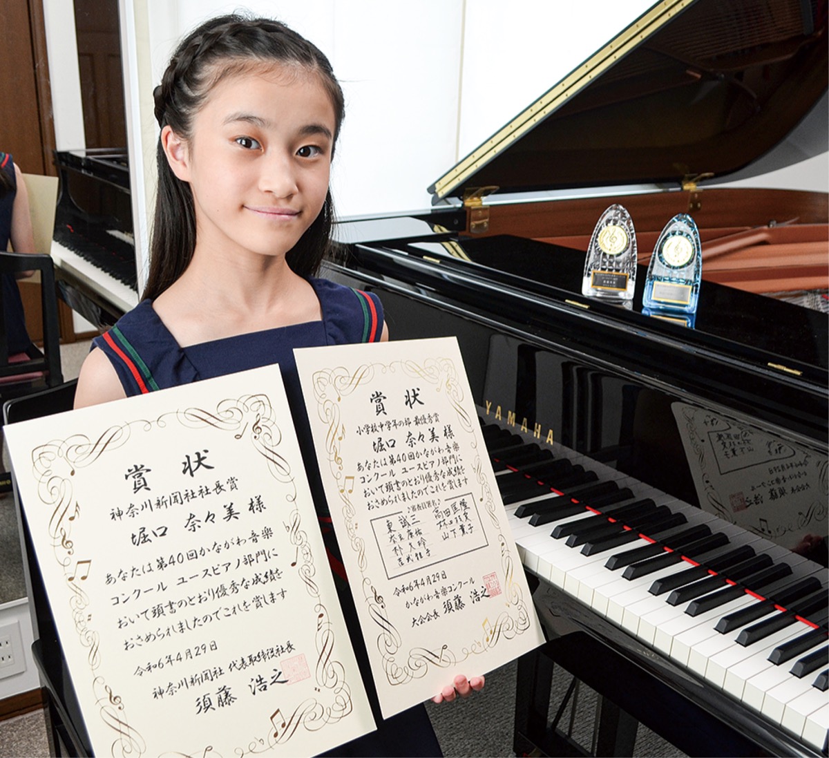 花水小学校5年生の堀口奈々美さん(桃浜町在住)が、4月29日に横浜市の神奈川県立音楽堂で開催された「第40回かながわ音楽コンクール」のユースピアノ部門小学校低・中学年の部で最優秀賞と特賞にあたる神奈川新聞社社長賞のダブル受賞に輝いた。