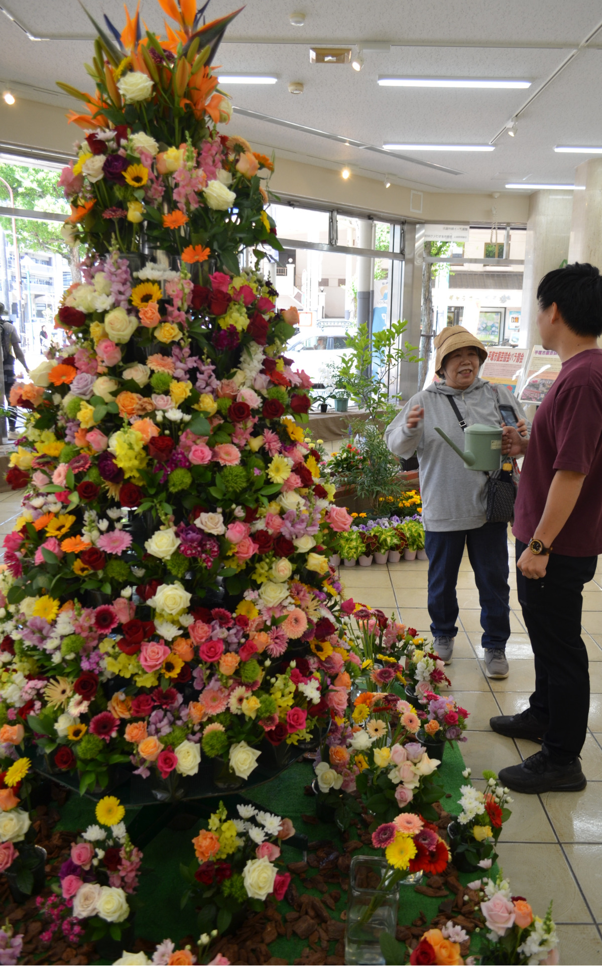 新型コロナの影響で5年ぶりの開催。目玉のフラワーツリー=写真=のほか、市内花卉(かき)農家が育てたバラや洋ラン、鉢物や切り花など約50品種300点が会場を彩った。
