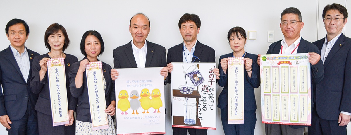 いじめ・自殺防止ポスターコンテストや標語コンテストで優秀賞を受賞した作品を表記したポスターなど4種類が、市内の小中学校45校へ寄贈される。標語には「迷わずに 助けを呼ぶのは 強さだよ」や「そのいじめ みているあなたも 共犯者」などのメッセージが記されている。