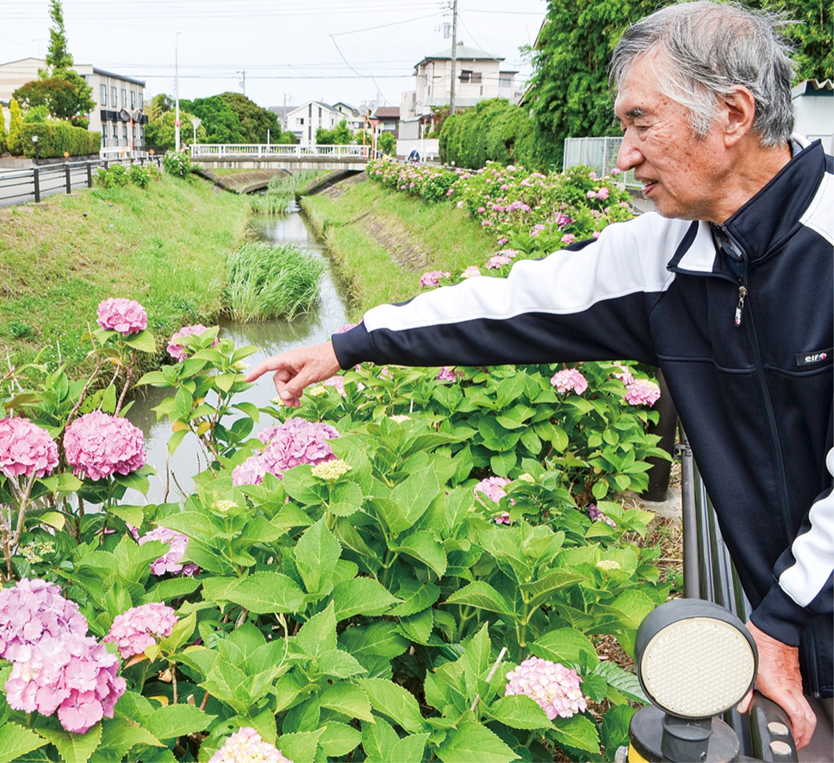 かまくら橋から下河原橋の約1・4Kmにかけ、西洋アジサイやガクアジサイが人々の目を楽しませる河内川。毎年6月上旬に開催されるあじさい祭りも、地域の風物詩として親しまれてきた。