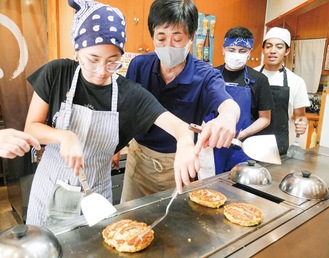 みくにでは、同店の店長・長瀬護さんや店員からお好み焼きやもんじゃ焼き、あんこ焼きの作り方を教わった。調理後、お好み焼きを初めて食べたメキシコ在住のサヤス メンドサ ダンテ オゥエンさん(26)は「エキゾチックな味。動くかつお節を見たことがない。メキシコに鉄板焼きがあるので帰って作ってみたい」と話した。