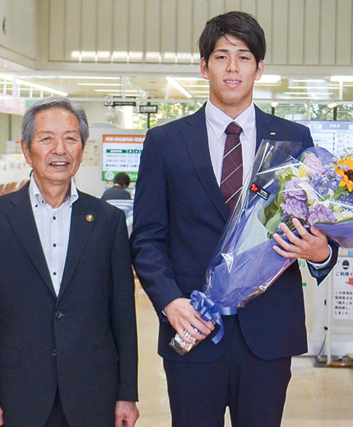 パリ五輪の競泳男子リレー自由形で日本代表に内定した平塚市出身の眞野秀成選手(23)が、6月5日に在住地の伊勢原市役所で高山松太郎市長を表敬訪問した。眞野選手は3月の国際大会代表選手選考会の200m自由形で4位に入り、初の五輪出場をつかんだ。