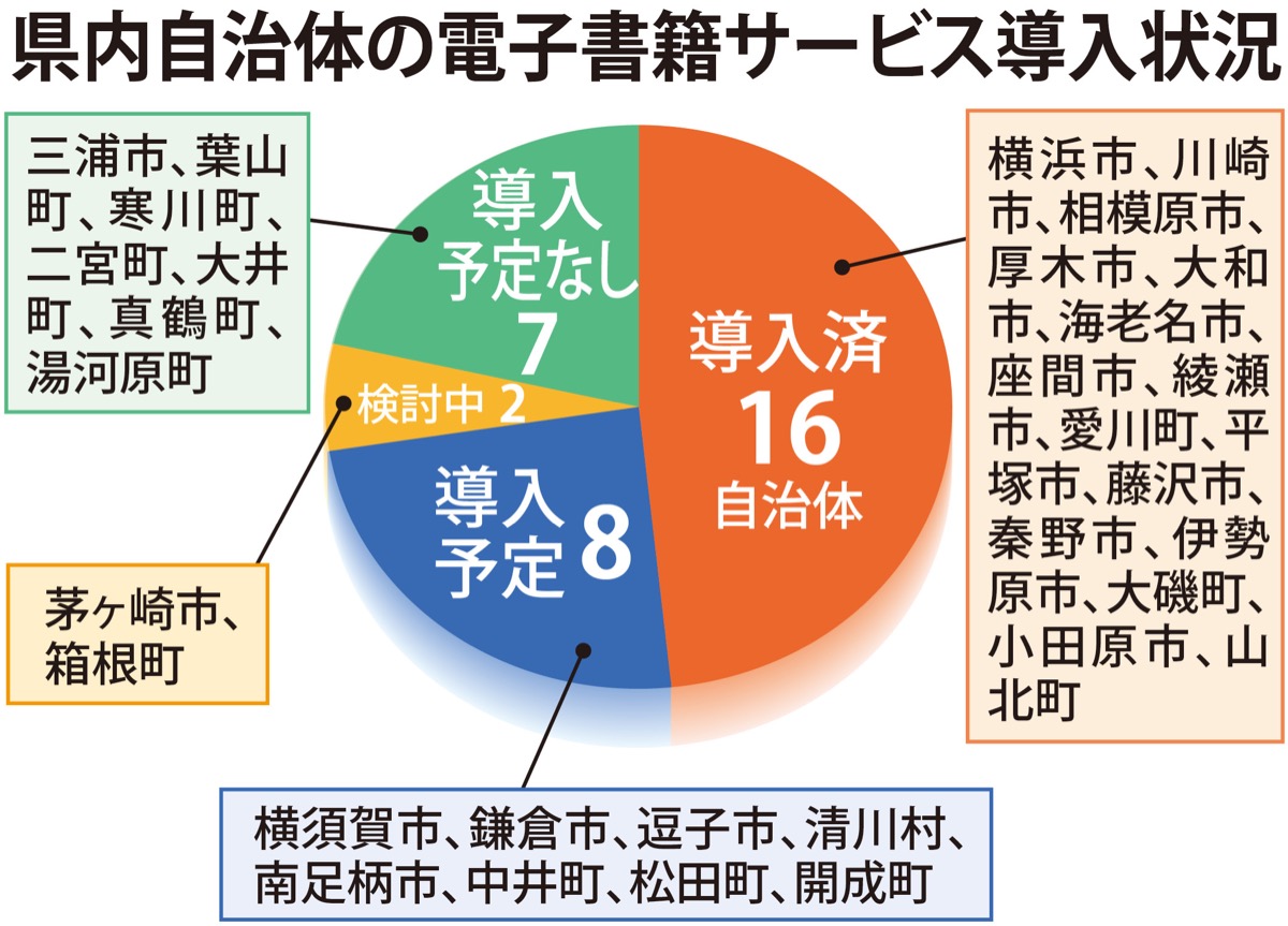 行政のデジタル化が進む中、タウンニュース社は神奈川県内の自治体の電子書籍サービスについて調査した。その結果、県内33自治体のうち、16自治体が公立図書館にサービスを導入していることが分かった。
