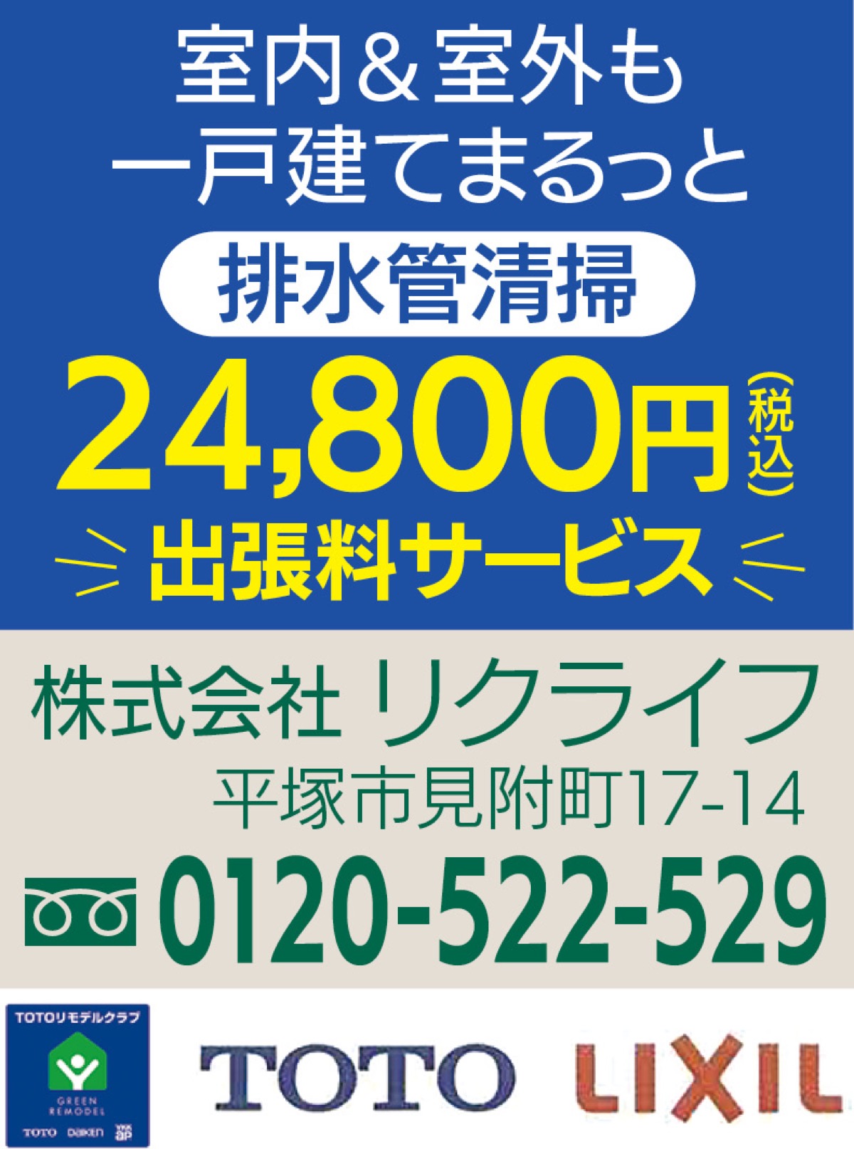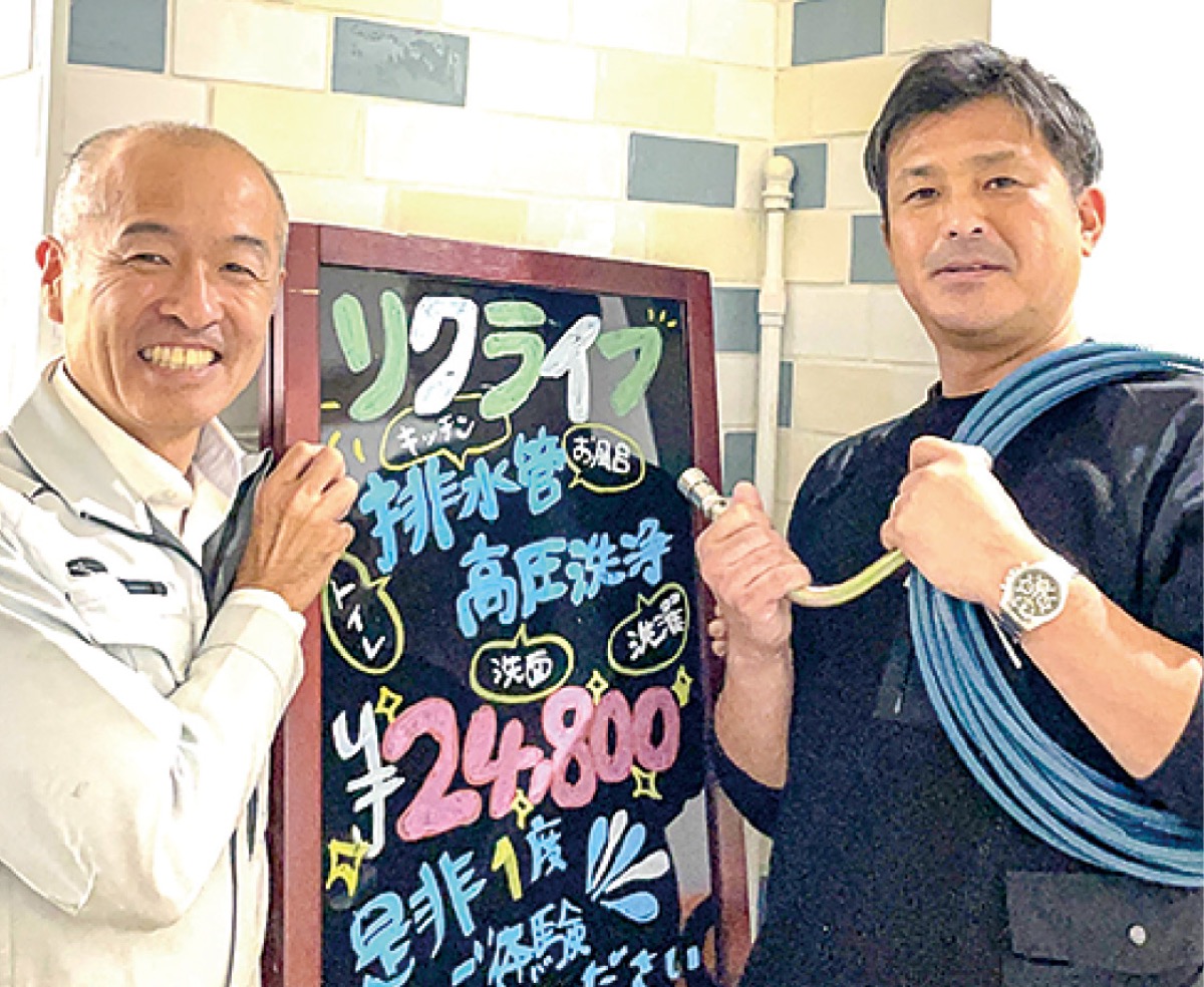 リクシルやTOTOなど大手メーカーも取り扱う株式会社リクライフ(平塚市見附町)の人気メニューが、プロの技術で根こそぎすっきり綺麗にパイプの掃除ができる「排水管高圧洗浄」。同社の矢島さんは、「気温が高いため、やわらかくなった油汚れが根こそぎとりやすい、今の時期におすすめ」と話す。