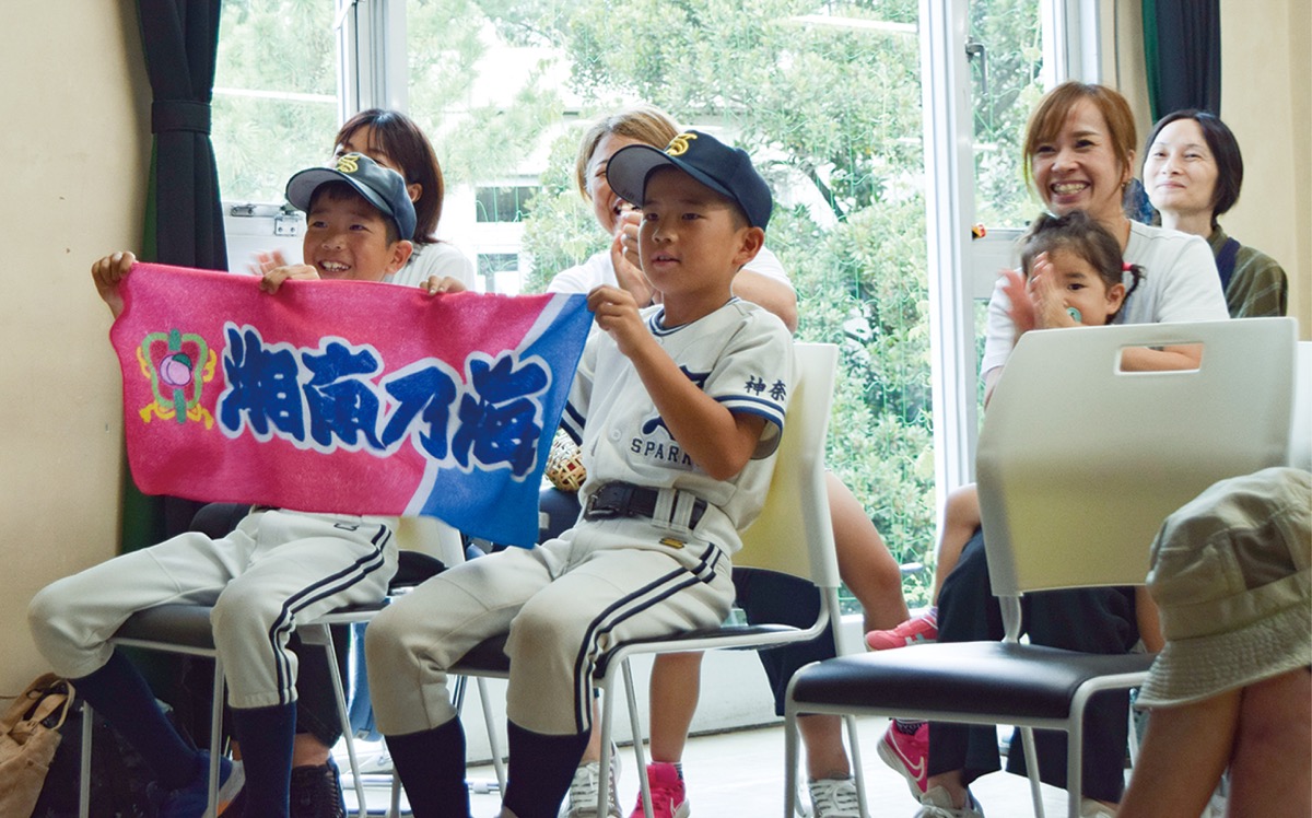 同チームの竹川侑寿さん(大磯小4年)と風間虎太郎さん(同3年)は「湘南乃海はエースで4番だったらしい。いっぱい食べて、身体を大きくしたい」と先輩の活躍に目を輝かせていた。