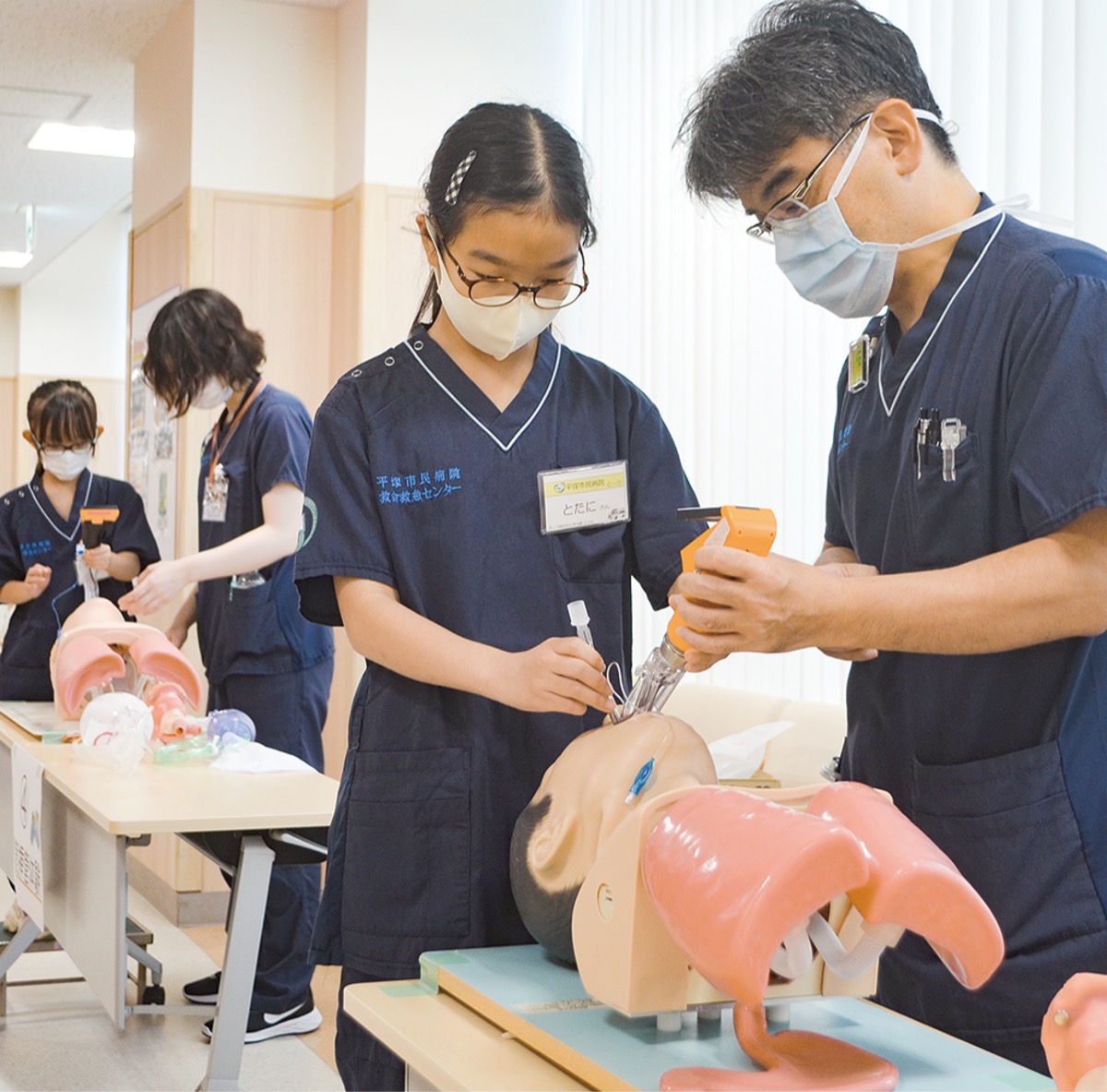 夏休みの小学生向け仕事体験「救命救急センター24時」が7月27日、平塚市民病院(南原/中川基人病院長)で初めて開催され、親子連れ約40人が参加した。