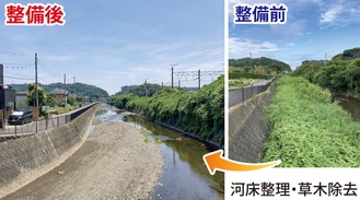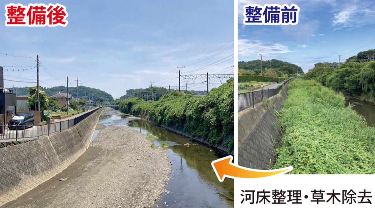 大磯町の国府地区を流れる不動川のJR東海道線北側は特に草木が生い茂り、台風などの増水時の溢水が心配だとのお声を地元の皆さまから頂きました。早速、平塚土木事務所に浚渫をお願いしたところ、今年の5月・6月で河床整理および草木除去の工事が実施されました。関係各位のご尽力に厚く御礼申し上げます。なお不動川の下流の浚渫要望についても、引き続き取り組みます。