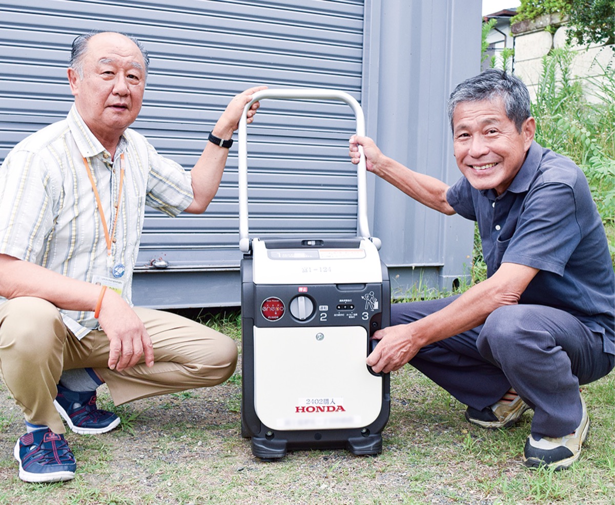 Aさん宅では、ポータブル電源や太陽光パネルを購入し、停電時に備えていたが、内部・外部バッテリーを合わせても13時間しか稼働を続けられないのが不安要素のひとつだった。そこで地元自治会ではガスボンベで動く発電機を購入。訓練では地域の発電機から電力を供給できるかなども初めて確認した。