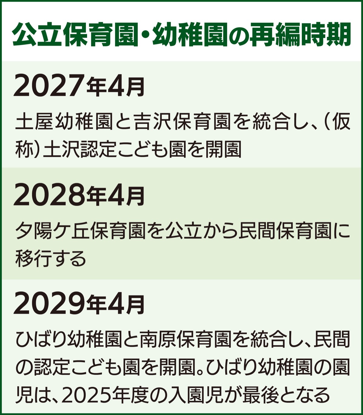 土屋幼稚園(土屋)と吉沢保育園(上吉沢)を統合してできる公立の認定こども園「(仮称)土沢認定こども園」は27年4月に開園するほか、28年4月には夕陽ケ丘保育園(夕陽ケ丘)を公立保育園から民間保育園へ移行し、民設民営とする。土屋とひばりの両幼稚園が保育園と統合されることにより、単独で存続する市内の公立幼稚園はゼロとなる。