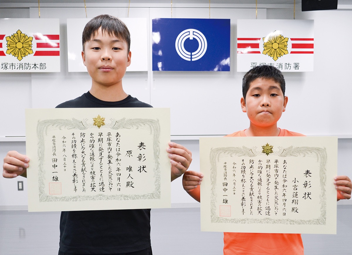 迅速な通報で火災の初期消火に貢献したとして、平塚市立豊田小学校6年の原唯人さんと小宮蓮翔さんに対し、9月13日に平塚市消防署本署で消防長表彰が行われた。