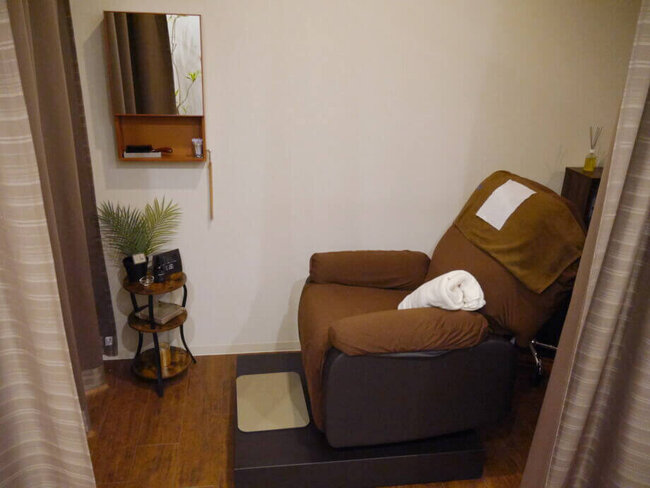 靴を脱ぎ、フカフカして座り心地の良いリクライニングチェアに身を置くと、心と体をリラックスさせてくれるアロマの香りが癒しを与えてくれる。このアロマは、植物の恵みである精油のみを厳選したものだという。