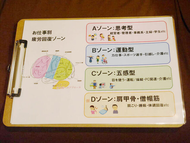 「脳疲労とは何かをしっかり伝えることも大切にしている」と真子さん。仕事内容によって脳の使う場所が異なるため、「仕事別 疲労回復ゾーン」が分かる表を用いて説明している。