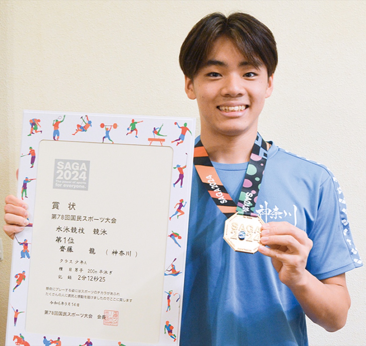 平塚市徳延在住の齋藤龍さん(慶應義塾高校2年)が9月14日から佐賀県で開かれた「第78回国民スポーツ大会」(旧国民体育大会)の競泳男子平泳ぎ200mで優勝を果たした。