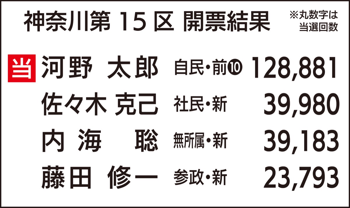 第50回衆議院議員総選挙の投開票が10月27日に行われ、神奈川15区(平塚市、茅ヶ崎市、大磯町)は、自民党前職の河野太郎氏(61)が12万8881票を獲得し、10回目の当選を果たした。