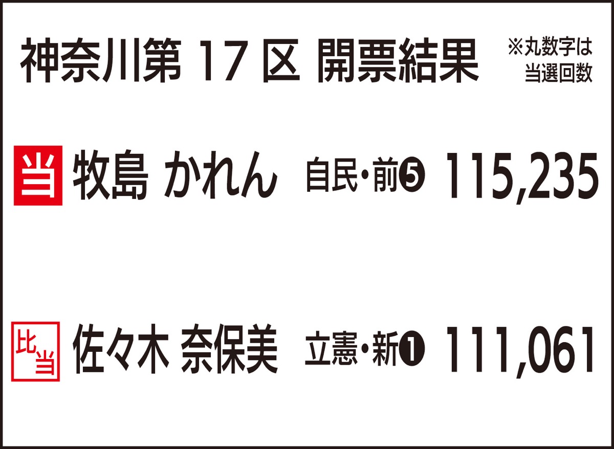 二宮町と中井町を選挙区に含む神奈川17区は、自民党前職の牧島かれん氏(47)と新人で立憲民主党の佐々木奈保美氏(55)の一騎打ちとなった。牧島氏が11万5235票を獲得し、佐々木氏の11万1061票を約4000票上回り、接戦を制した。佐々木氏は比例代表南関東ブロックで復活当選した。