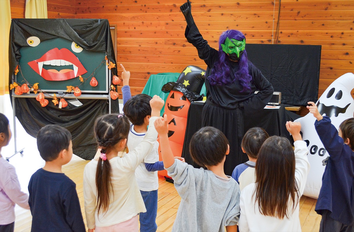 当日ジョウジョウさんは緑色の仮面を着けた魔女の姿に扮し、歌や踊りに合わせて英会話をレッスン。園児たちも楽しみながら英語を学び、「トリックオアトリート」と元気な声を上げていた。