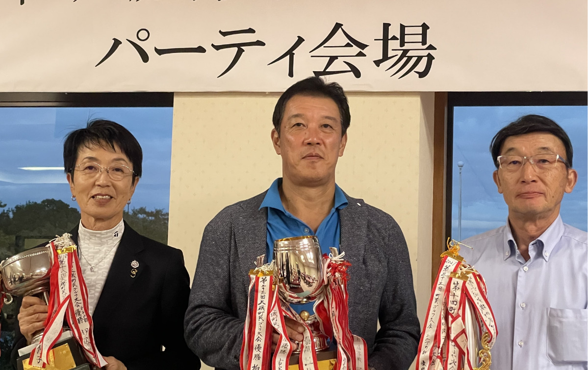 女子の部は千葉妙子さんがグロス(G)77、ネット(N)72・2で優勝。65歳以上の男子シニアの部は加藤雄司さんがG102、N69・6で、また年齢制限なしの一般男子の部は丸尾和生さんがG87、N69でそれぞれ栄冠を獲得した。秋晴れのもと、参加者は町民ゴルフ大会を楽しんでいた。