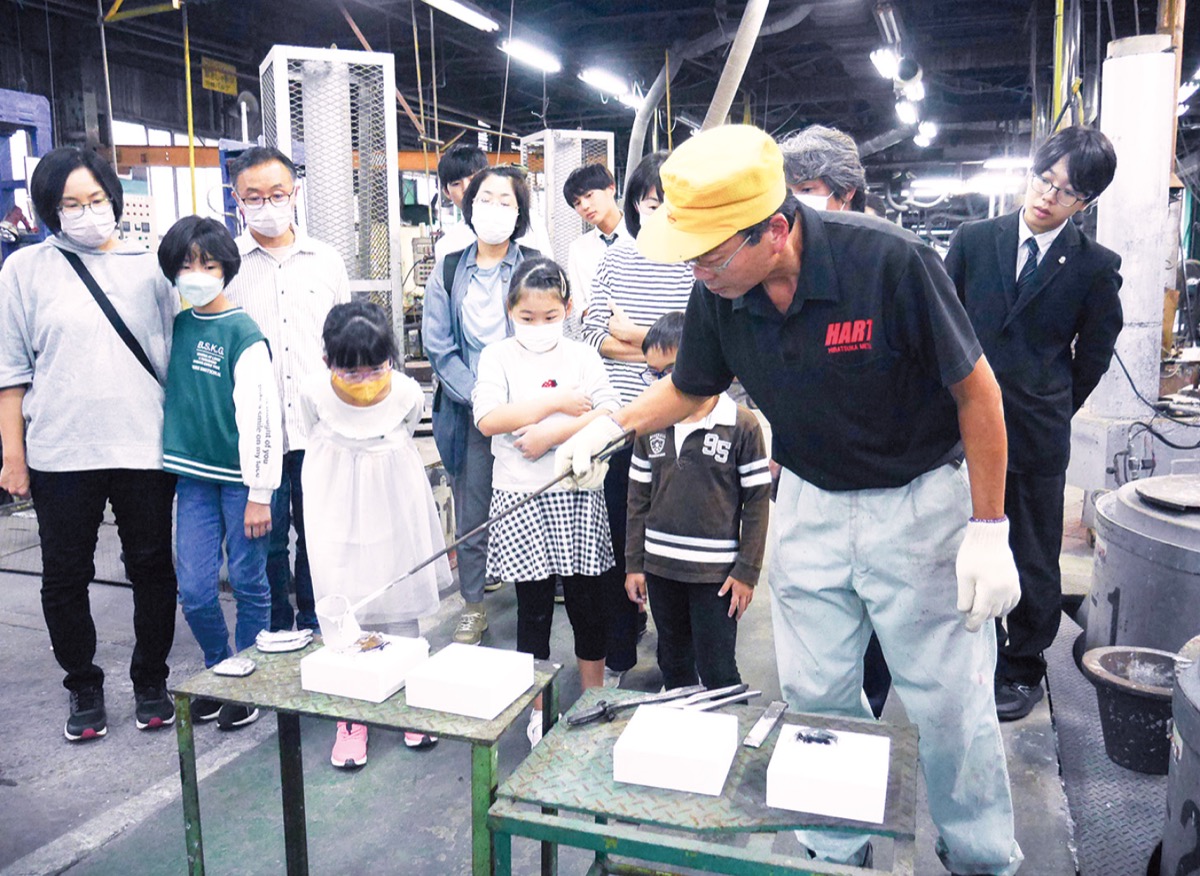 同イベントは、平塚中等教育学校の生徒6人が授業の一環で企画運営を行い、参加者と一緒に平塚のものづくりを学んだ。同社の小久保明和社長は「こうした事業は初めて。鋳造は言葉だけだと分かりにくい。みなさんに知ってもらえて良かった」と話した。同社は自動車のエンジンの一部となるピストンのシリンダーを製造している。