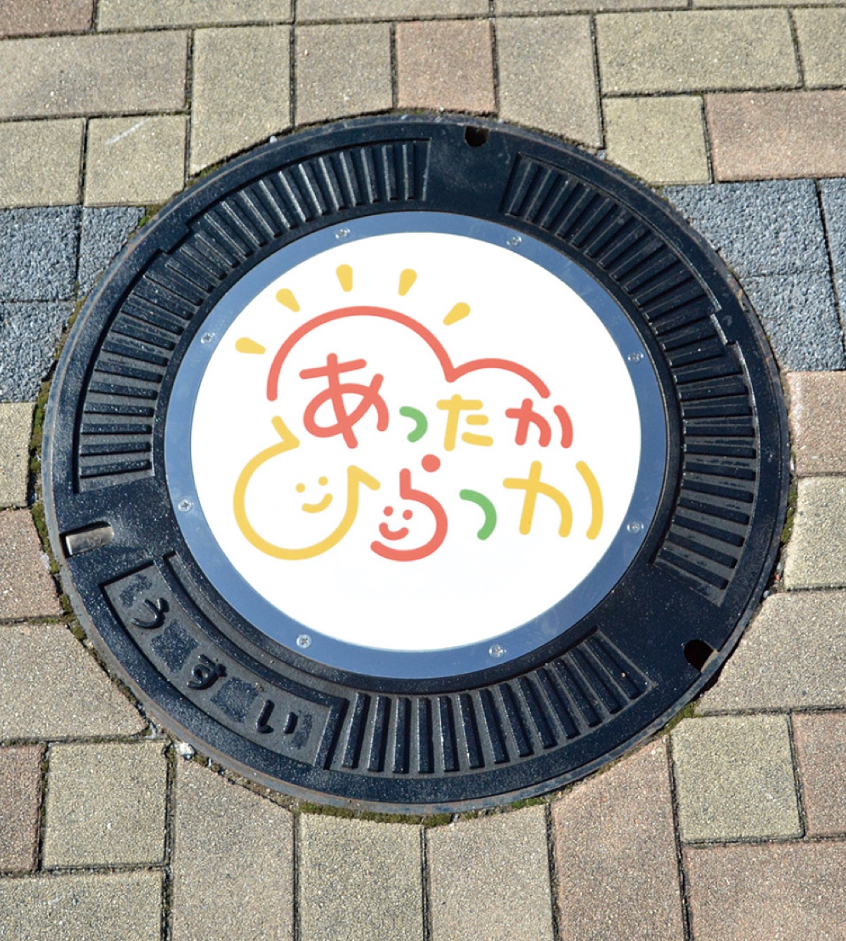 平塚市の新スローガン「あったかひらつか」のロゴマークが印字されたマンホールが11月7日、平塚市役所南東の4カ所に設置された=写真。