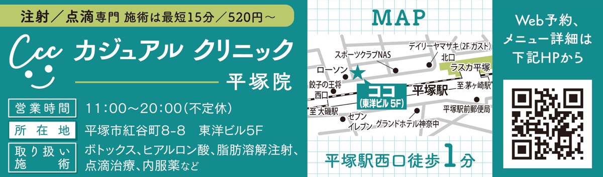 ボトックスなどの美容注射・点滴専門「カジュアルクリニック」が11月、平塚駅西口徒歩1分の紅谷町に開院した。