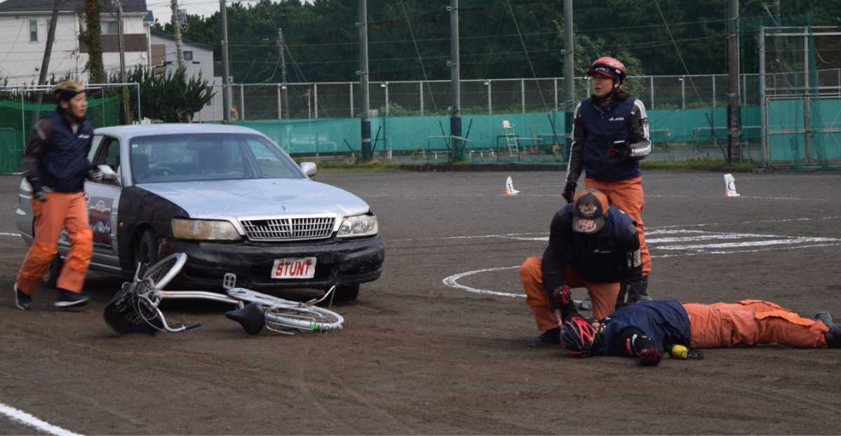 小雨の降る中、同校の校庭でスタントマンが運転する逆走自転車や、一時停止無視の自動車との実際にあった交通事故の事例を実演で披露。交通ルールの順守や、日頃から危険を予測する大切さを訴えた。