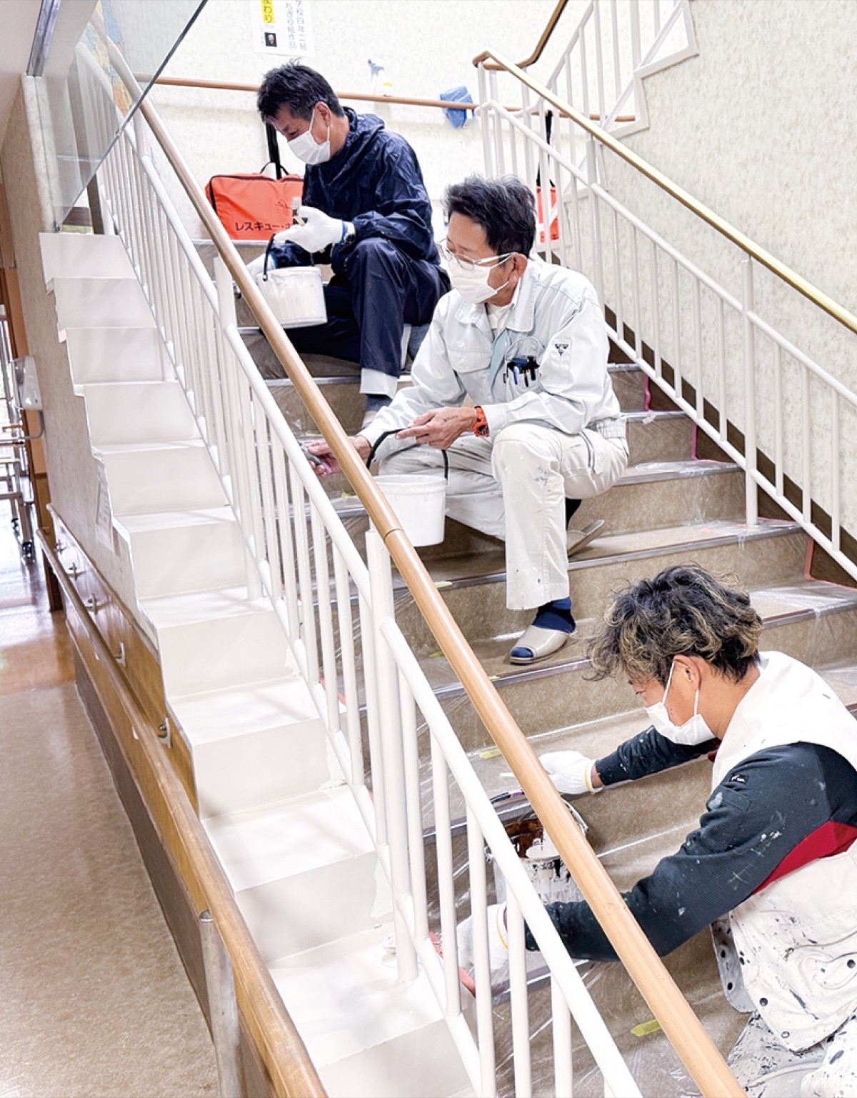 同組合は毎年、地域の福祉施設を対象としたボランティアを実施。今年は組合員15人が2組に分かれ、ソーレ平塚(寺田縄)の駐車場の白線や階段の手すり、ひかりの家(御殿)のぬれ縁や吊戸棚を塗り直した。服部組合長は「私たち組合も普段地域に支えてもらっている。少しでも恩返しができれば」と話した。