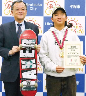 平塚市立春日野中学校3年の高石颯来(そら)さんが、(一社)日本スケートボード協会主催の「AJSA2024全日本アマチュア選手権大会」でストリートの部3位の成績を収めたことをうけ、11月26日に平塚市の落合克宏市長を表敬訪問した。