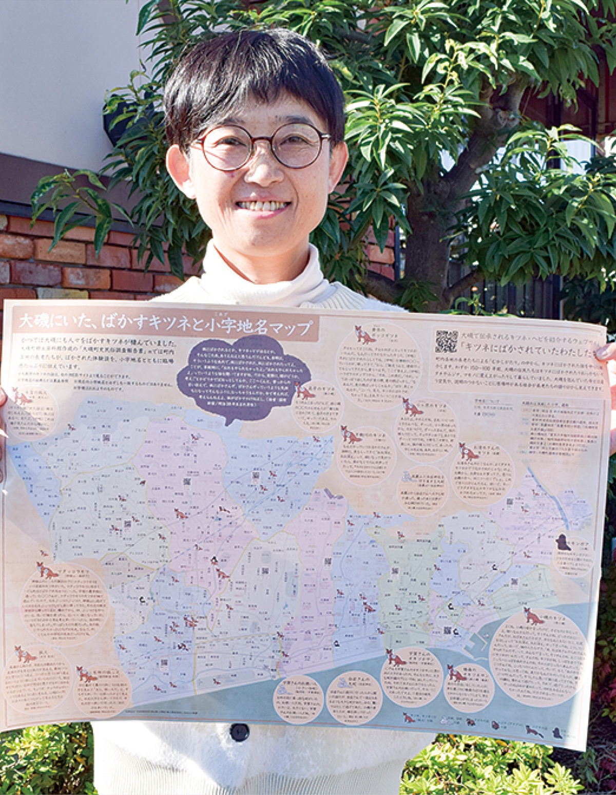 大磯町史民俗調査報告書などの文献のほか、大磯町郷土資料館の学芸員が残した資料を調べる中で、キツネにばかされた話が数多くあることに興味を持ったオダギリさん。登場する小字を理解することで、よりエピソードが鮮明に思い浮かべられると、キツネの話もマップに盛り込んだ。マップの二次元コードを読み込むと、キツネの話をまとめたウェブサイトが表示される。