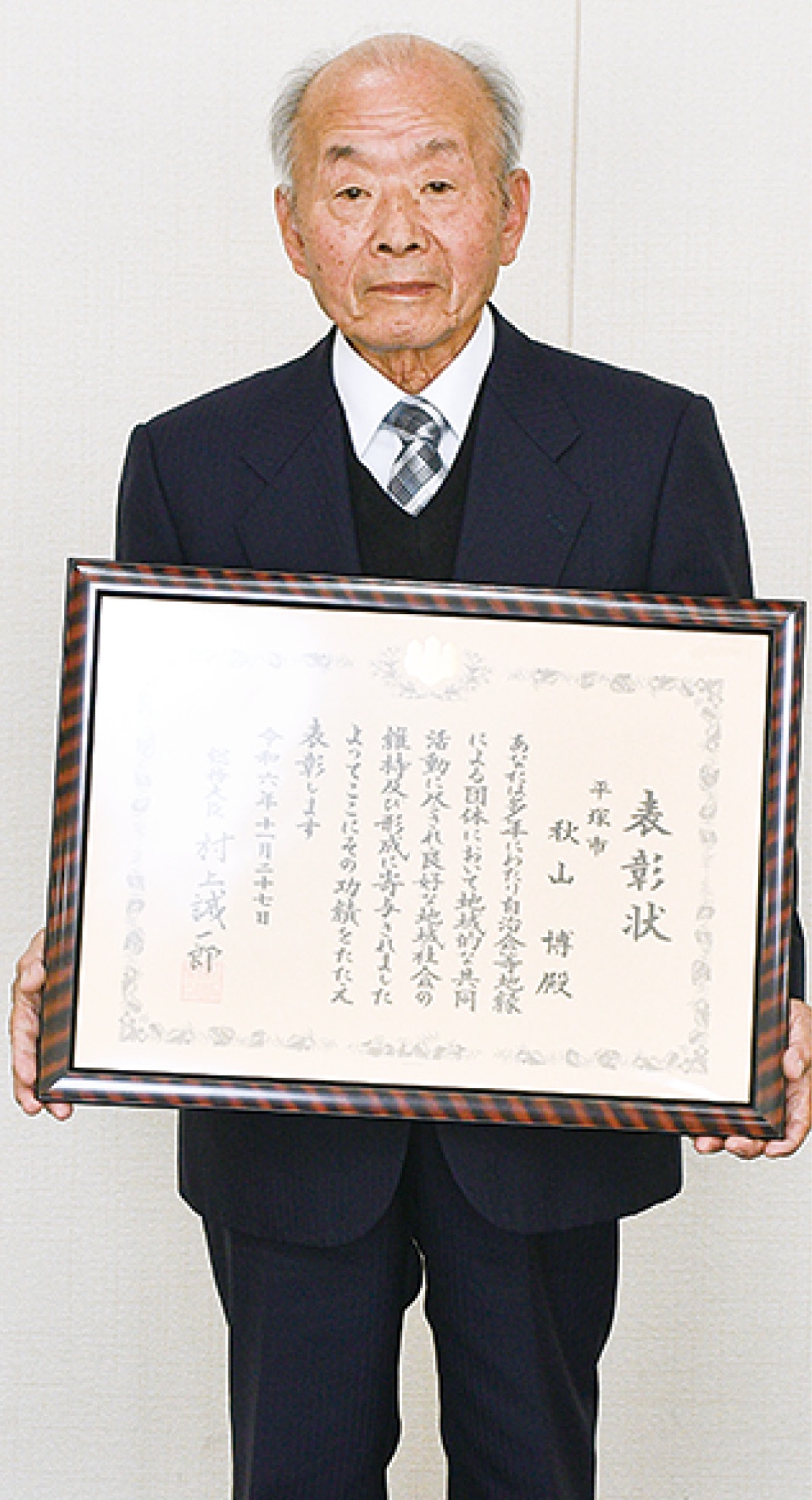 平塚市金目地区の片岡北自治会会長を務める秋山博さん(87)がこのほど、総務省の「2024年度地縁による団体功労者総務大臣表彰」を受賞した。市内の自治会長では2人目の受賞。