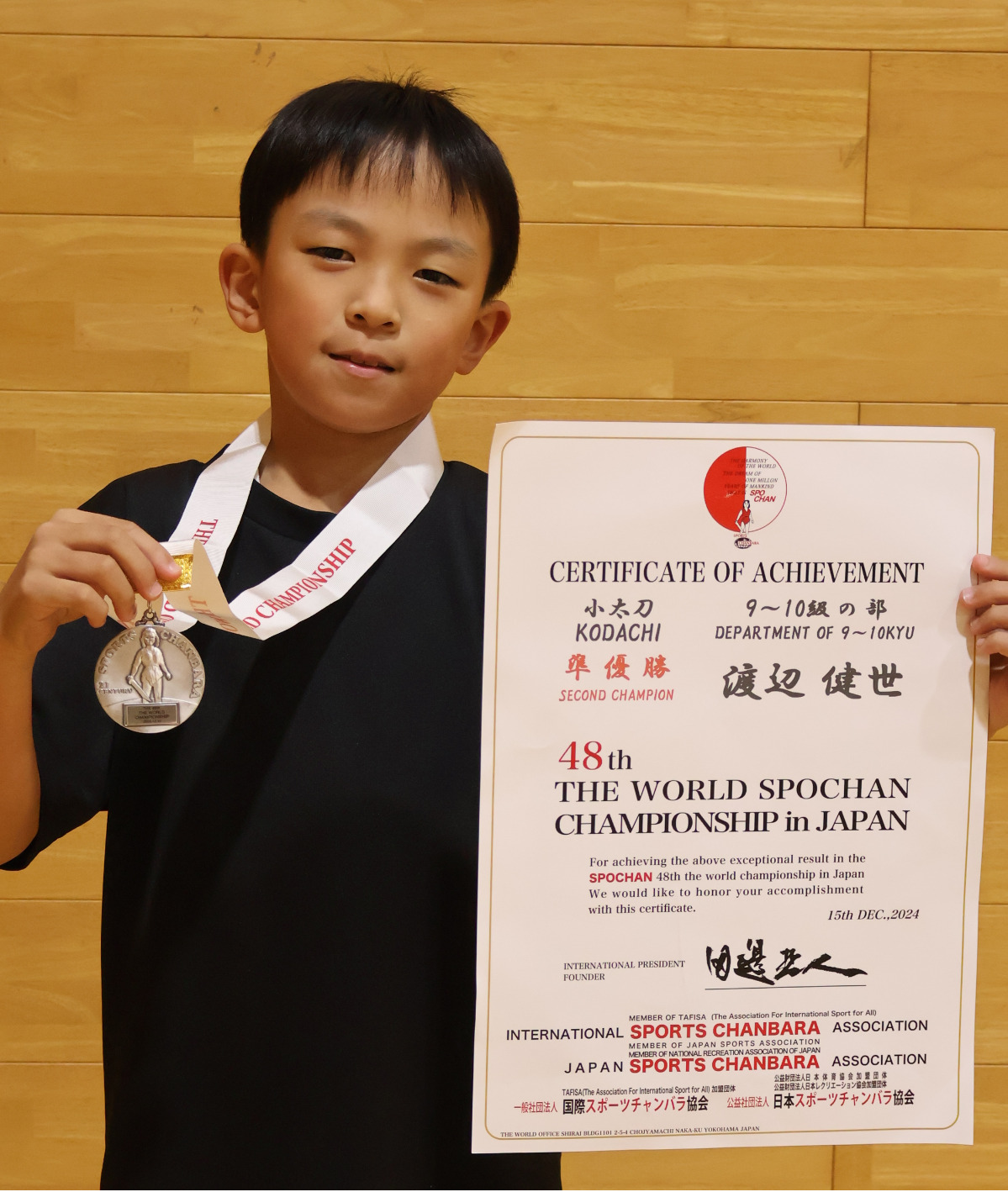 秦野市スポーツチャンバラ協会所属の渡辺健世(けんせい)さん(平塚市立みずほ小3年)が、12月15日に墨田区のひがしんアリーナで行われた「第48回世界選手権大会」の小太刀9〜10級の部で準優勝を果たした。大きな大会での入賞は初となる。