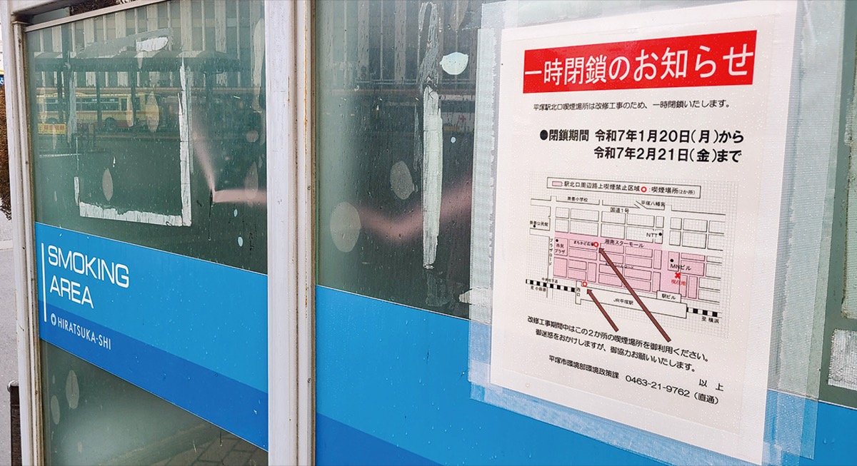 「平塚駅北口喫煙場所」(宝町)の改修工事が1月20日(月)から始まる。コロナ禍が明けた2022年ごろから、バス停留所で待つ人や通行人から市に対して、「たばこの匂いや煙が気になる」などの意見が多数寄せられていたという。
