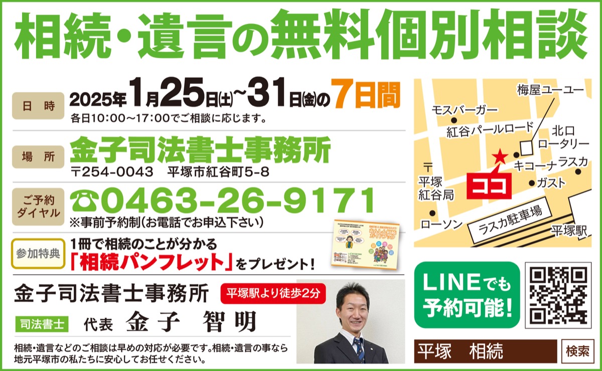 相続や遺産の相談をこれまで2100件超受けてきた金子司法書士行政書士事務所(平塚市)が1月25日(土)〜31日(金)、事務所で好評の無料相談会を実施する。