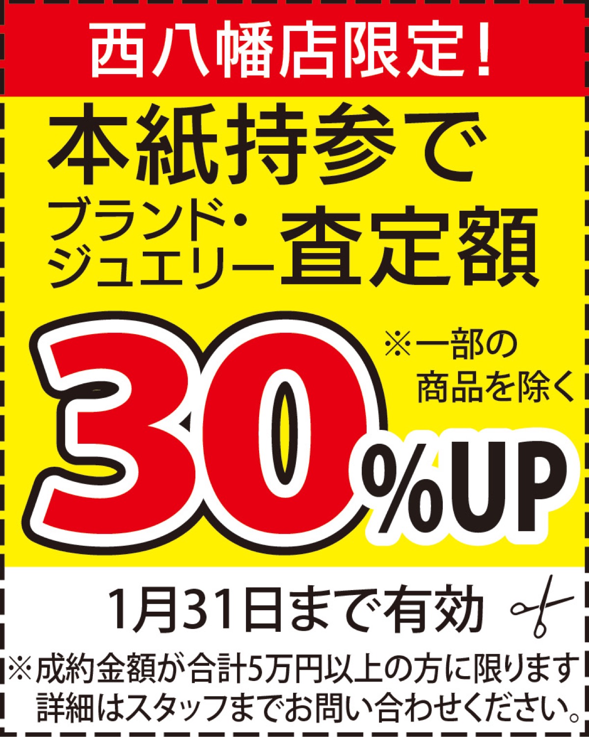 1月31日までは、【1】5点以上の成約で最大1万円、【2】出張査定と来店予約でさらに最大1万を進呈する(ブランド・ジュエリー以外の商品を除く)キャンペーン開始。【3】本紙掲載のクーポンを利用すれば、査定額30%アップの特典も。