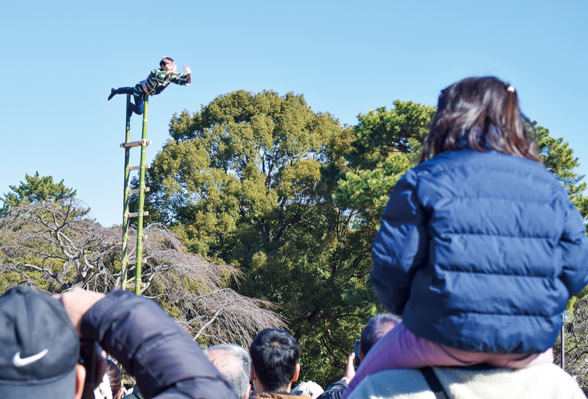 演技の部では、法被姿の平塚古式消防保存会が木遣り、まとい振込み、はしご乗りを披露。竹製のはしごの上で、木遣り歌に合わせて次々とポーズを決め、来場者から拍手を浴びていた。